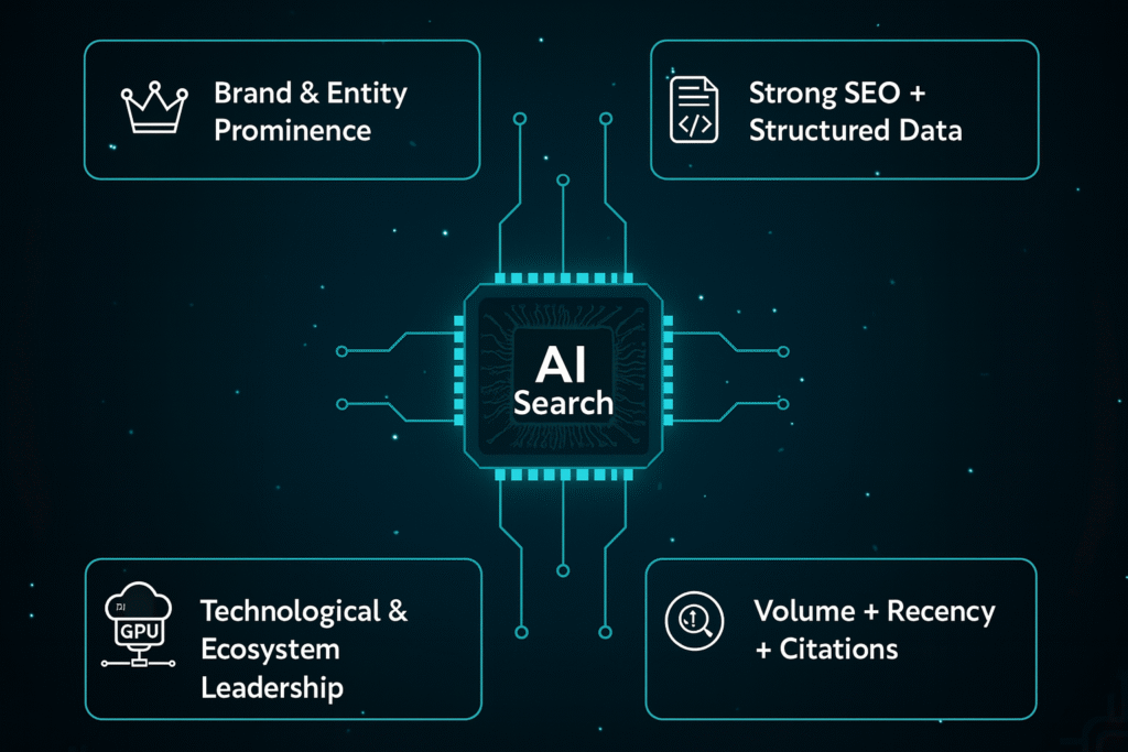 - Their dominance isn’t just hardware: they offer developer ecosystems (CUDA, SDKs), platforms and services that ensure their products get mentioned in articles, research, developer forums, benchmarks and therefore searched and cited.